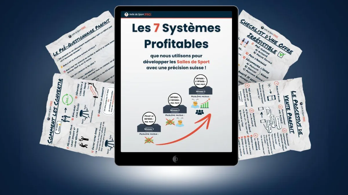 7 Systèmes Profitables est un guide gratuit contenant les MEILLEURS Systèmes pour développer une salle de sport en 2025. Ce sont ces mêmes stratégies qui font réussir nos clients, des propriétaires de salles de sport. Découvrez les 7 Modèles pour rendre votre salle très profitable.
